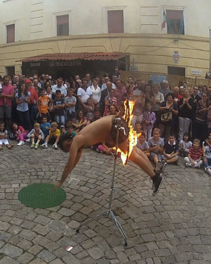 Giocoliere con attrezzi luminosi ed infuocati tra cui clave, cerchi, palline a led, torce di fuoco ed in esclusiva il giocoliere con autentiche lame affilate anche da bendato!